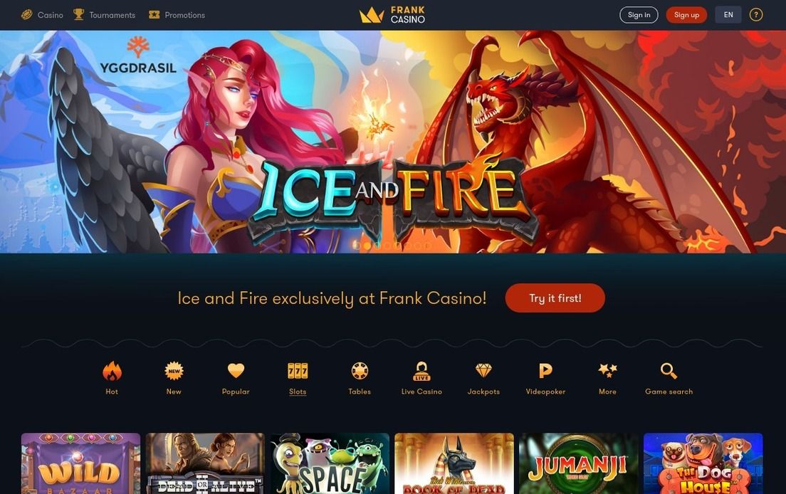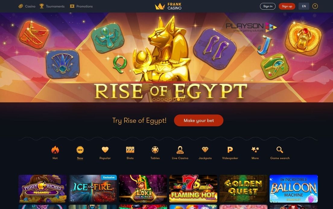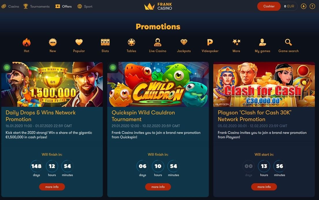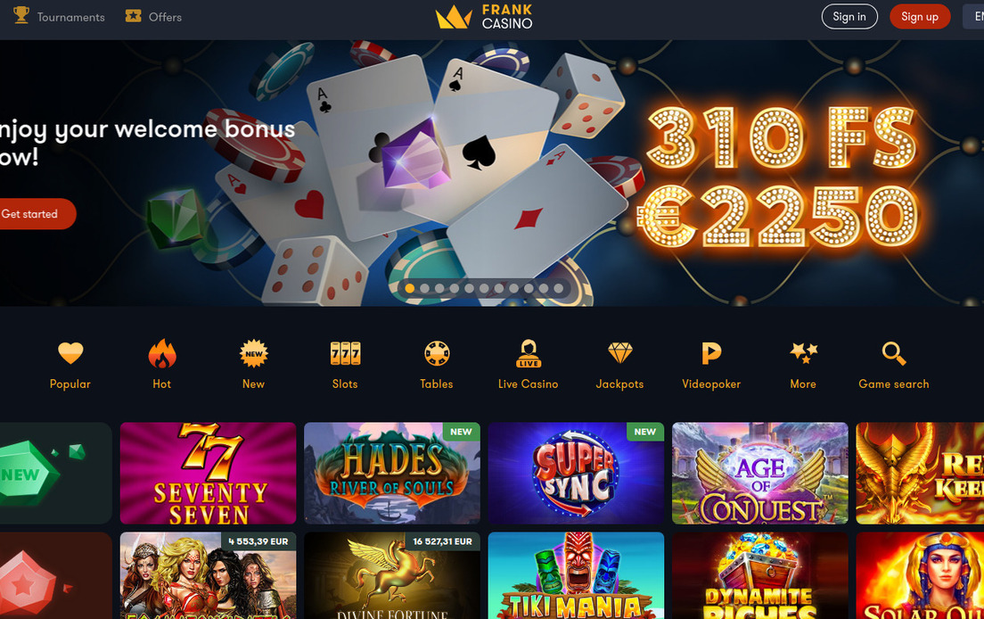 Alternatively, use Frank's search bar if you already know the type of games you would like to play. In addition, you can play table games, such as baccarat, blackjack, and roulette. There is something for every game fan, so that no one gets bored!