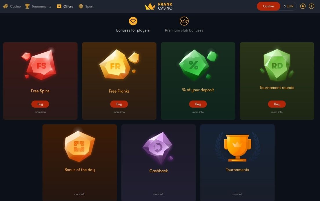 Frank Casino offers its customers a variety of bonuses and promotions. Its welcome package for new players looks impressive. When registering, a player can take 100% on the deposit from €10 or 100% + 50 spins on the deposit from €100