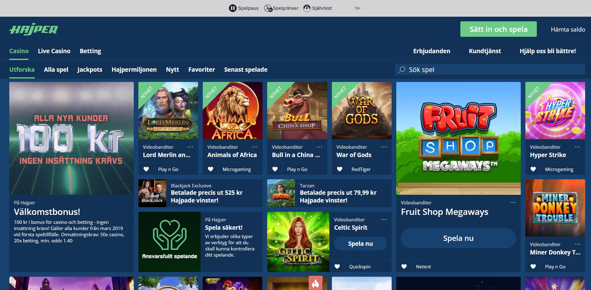 In Hajper, players will find popular slot machines from Play´n GO, NetEnt, Microgaming, Yggdrasil and other providers. Players have access to games like The Book of the Dead, Vikings, Mega Fortune, Mega Moolah, and many others. If users of the casino website want to play in the Live Casino, they will find a wide selection of roulette and blackjack games.