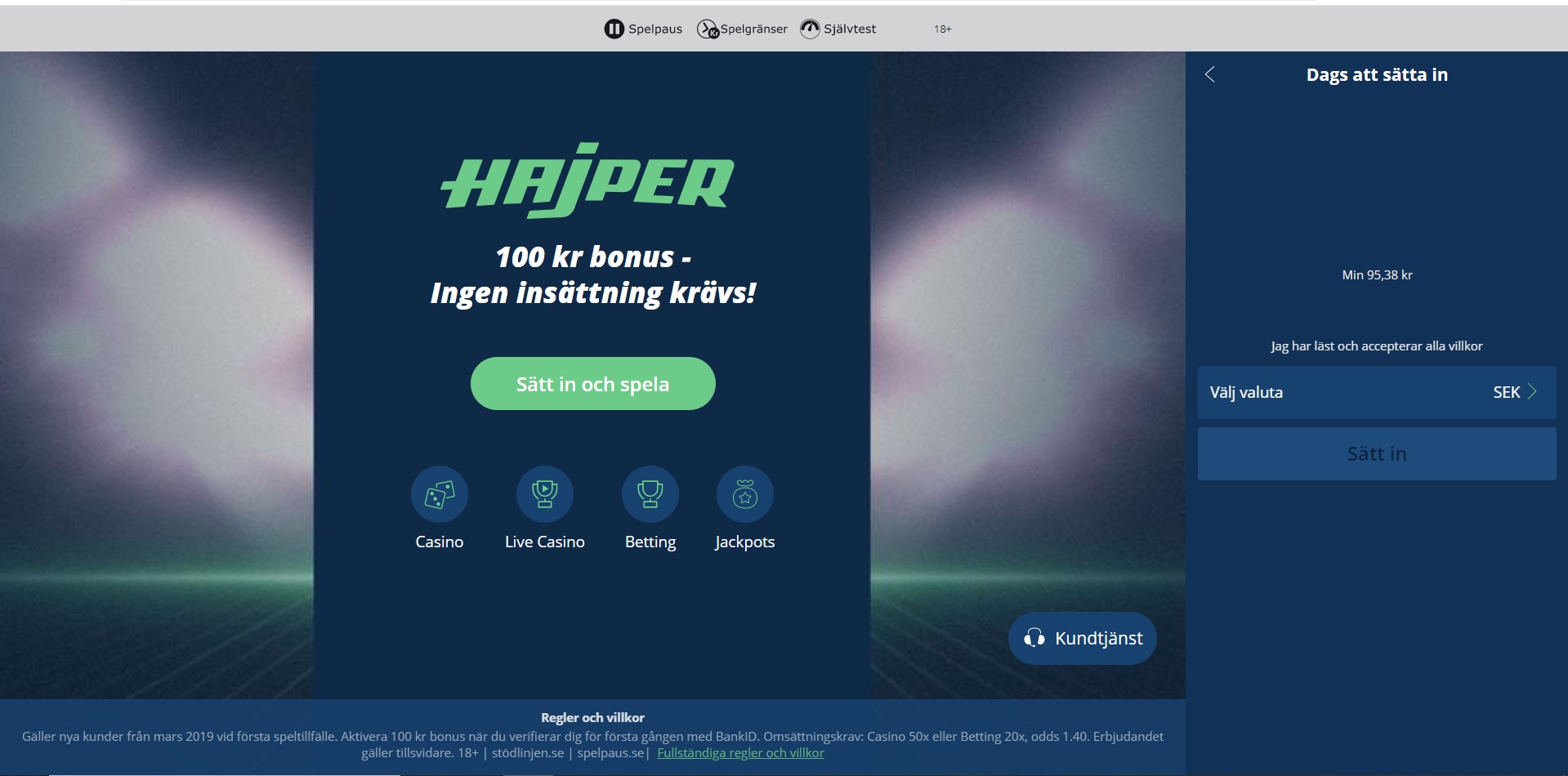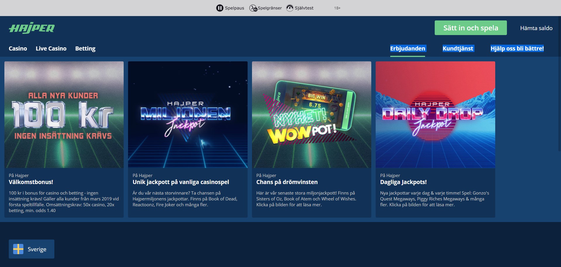 Swedish law prohibits online casinos from using bonus offers in addition to welcome bonuses. The welcome bonus of Hajper Casino are free spins for the slot of the day. Players can use this bonus at any time without any restrictions.