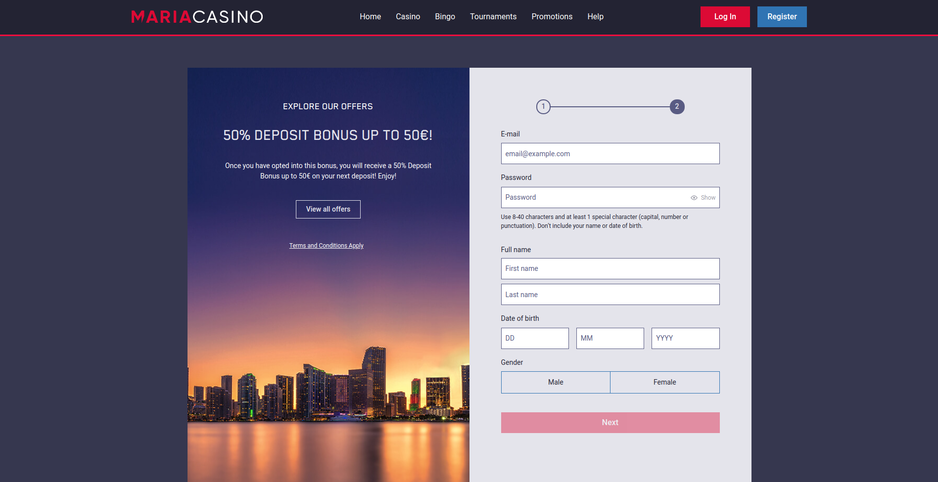 Since you have to provide a lot of data, the registration process is divided into several stages. Firstly, choose the country of which you are a resident, enter your e-mail and phone number. In the second step, you need to provide more specific personal data, including name, gender, age, etc. In the third step, you will need to answer a few security questions to protect your account. At the final stage, you can choose a welcome bonus or refuse it. By making a minimum deposit, you can enjoy the best Maria Casino's game experience when playing any games from its vast portfolio.