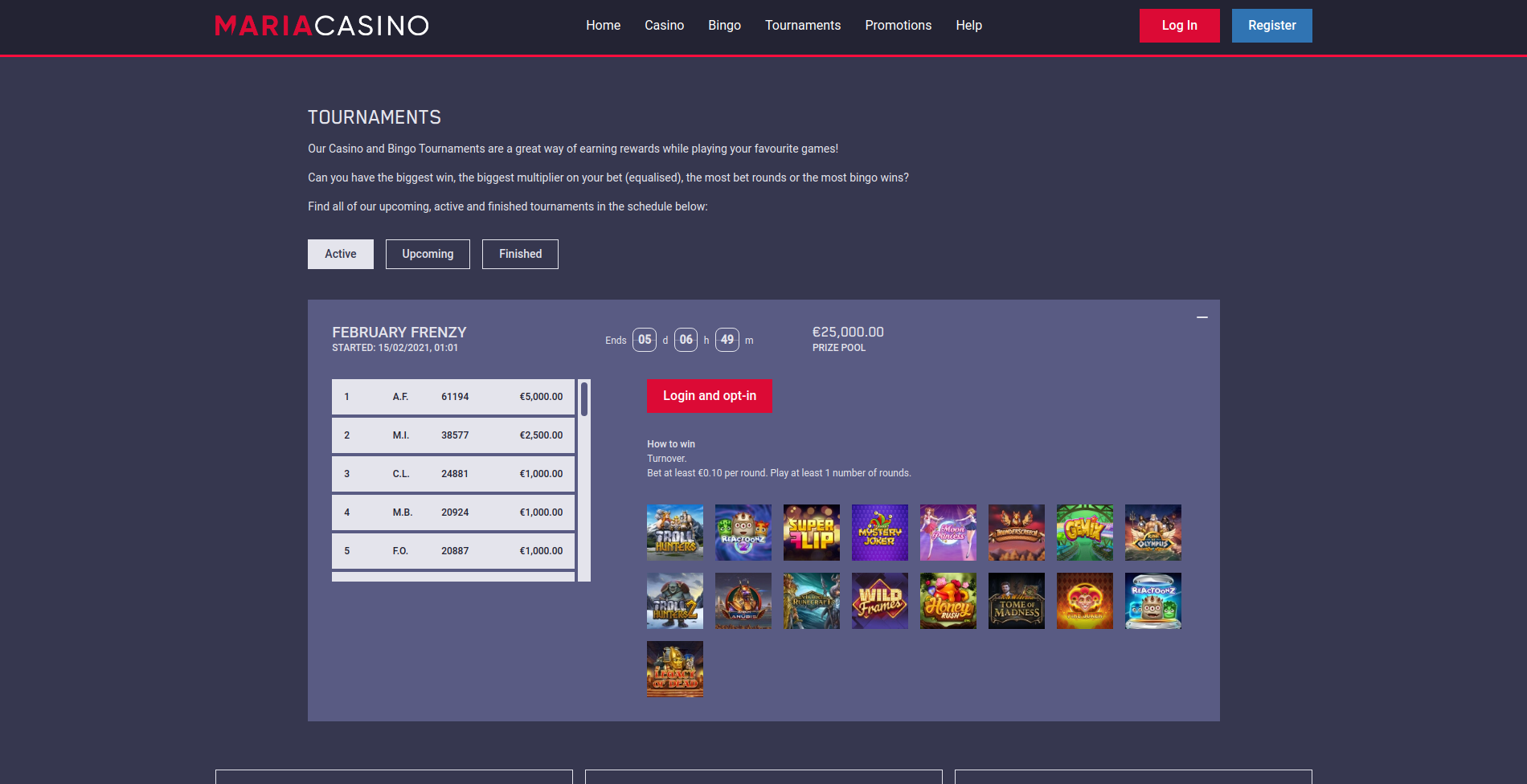 In addition, Maria Casino offers daily tournaments in slots and bingo games with large prize pools.