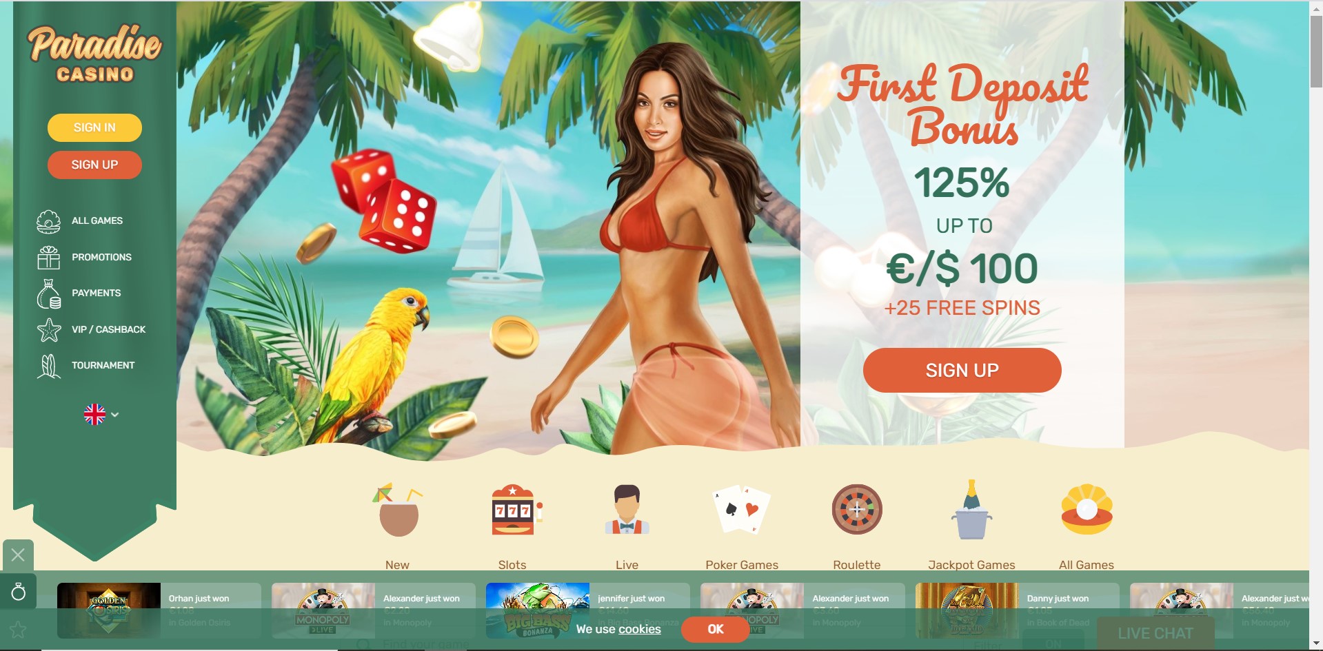 At the time of writing, the Paradise Casino Bonus for new players is as € 300 + 60 FS