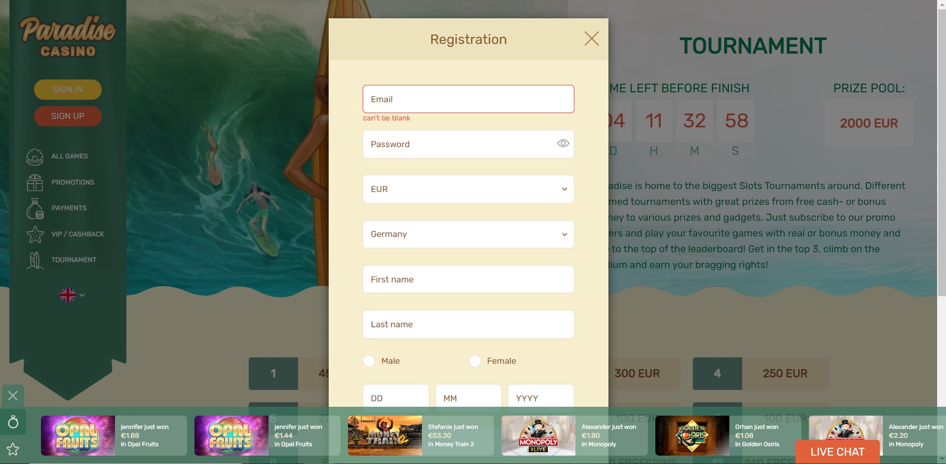 To become a registered member of Paradise Casino you firstly need to click on the ‘Join’ button in the top right hand side of the home page. Doing this will take you to another page where you will be required to input the following information: