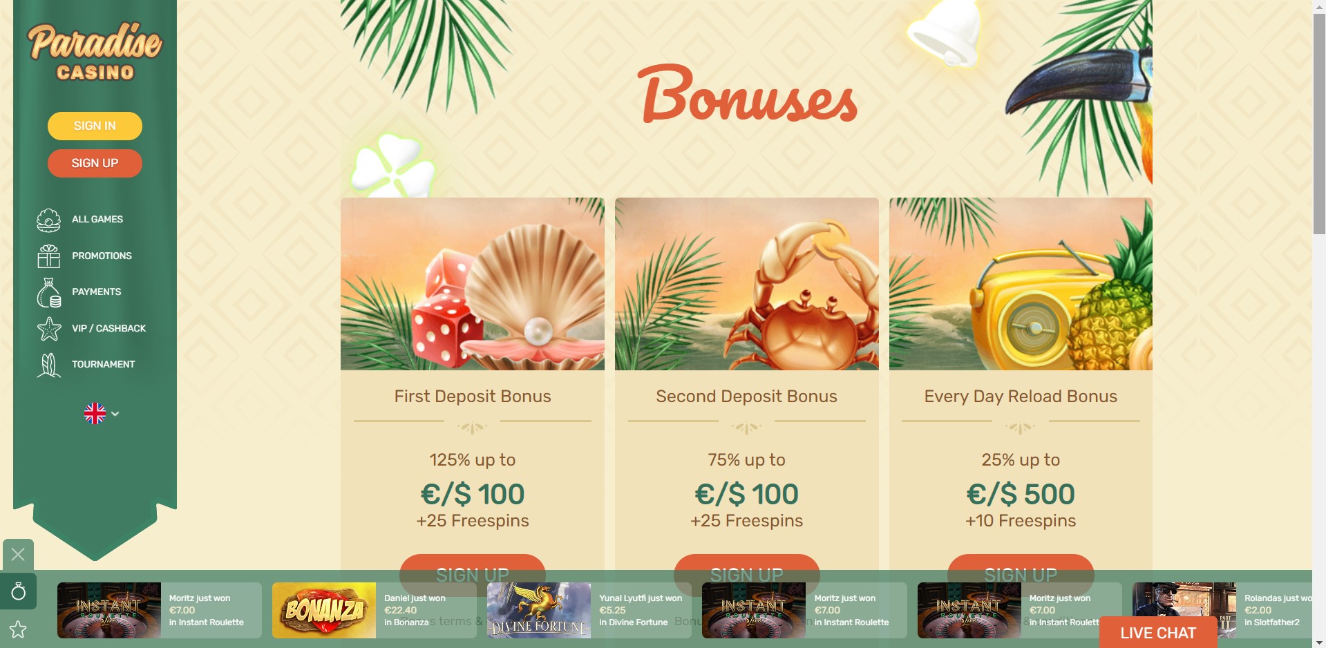 Bonuses are offered to players at all times at completely ad-hoc times. Promotions are also run at various points too so be sure to keep your eyes peeled from them. Here we are going to focus on the Paradise Welcome bonus for new players.