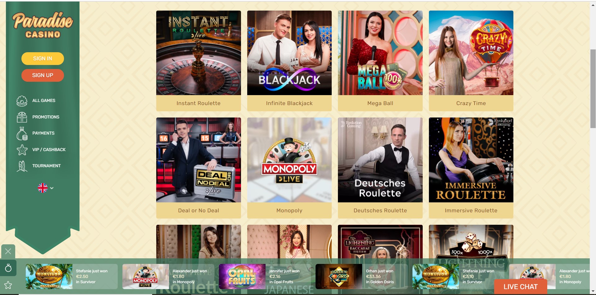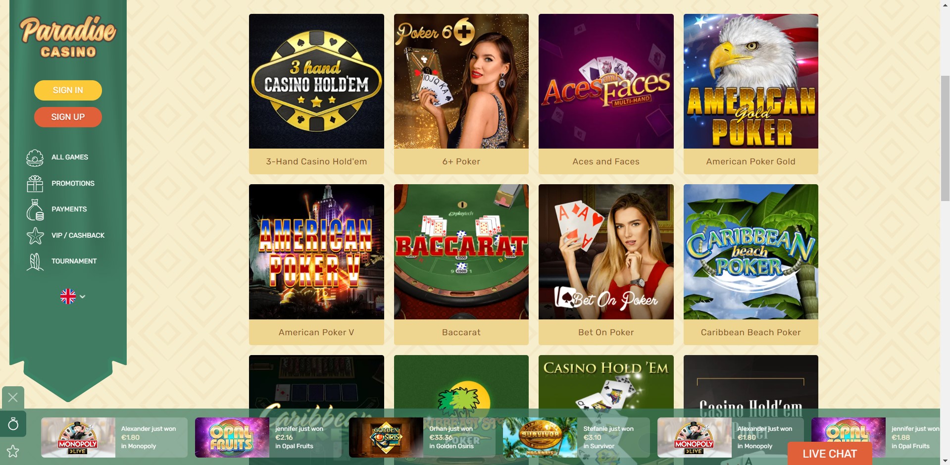 Paradise Casino has a whole host of games covering table games, slots, jackpot, live, and video poker games.