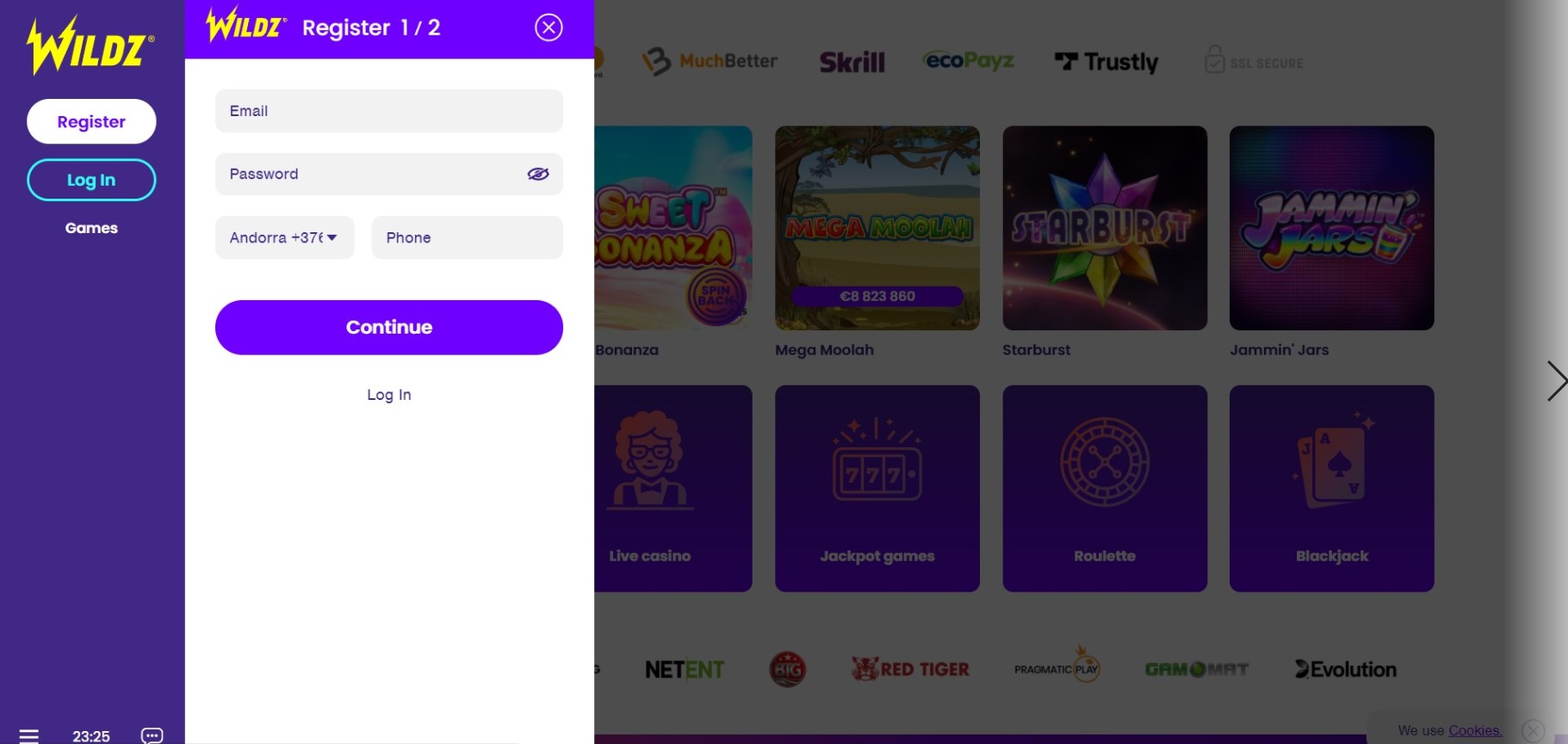 To register at Wildz Casino for the first time, simply click on the "Registration" button, and the registration process starts. You can either register with your e-mail login data or you can log in using the form directly on the page.