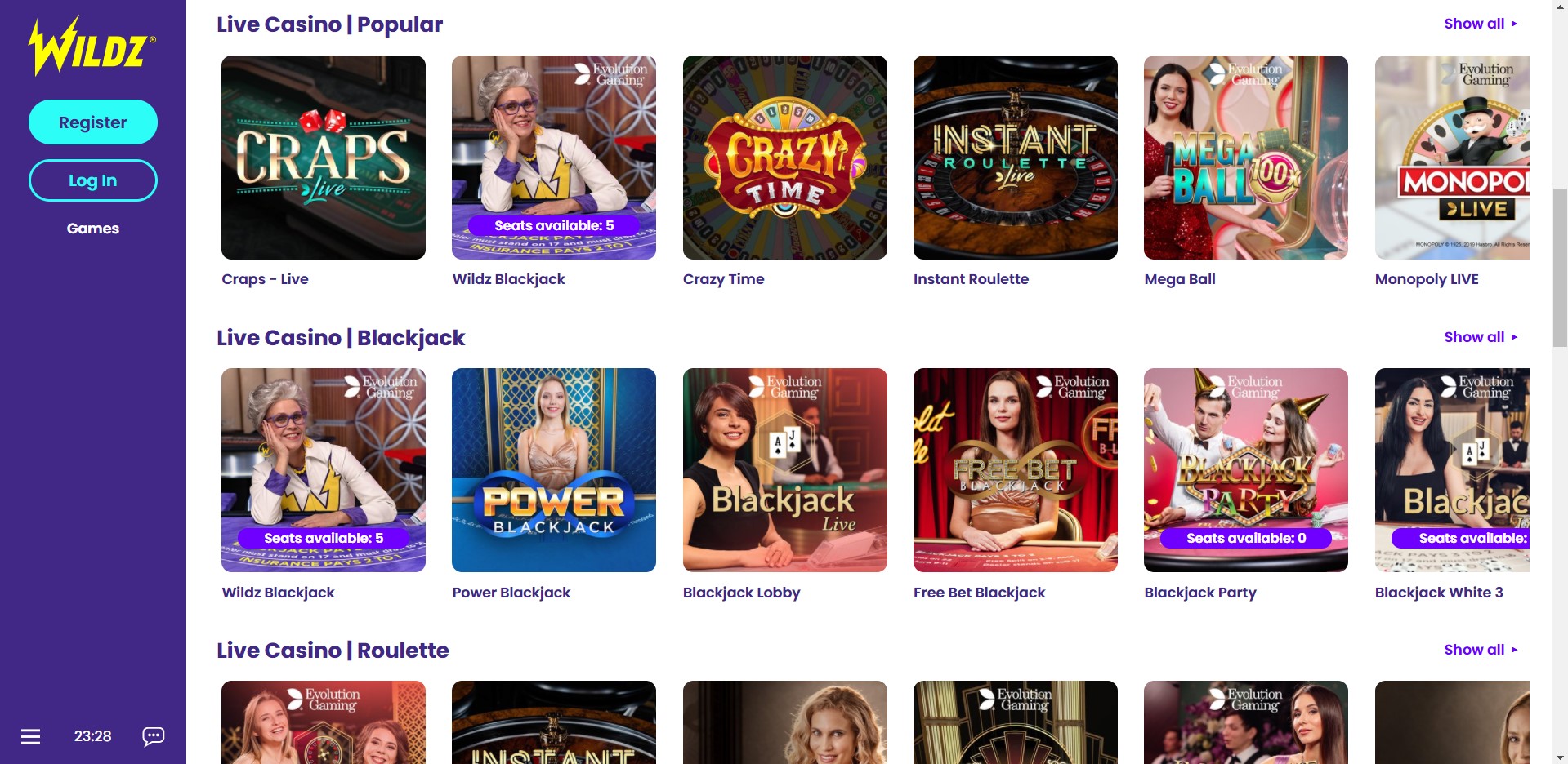 Again, we can play online at Wildz' Live Casino versus real live dealers. As usual, the tables with live blackjack and live roulette dominate the scene. However, other games are also available live: Baccarat, dice games like Super Sic Bo, Monopoly Live and, naturally, poker tables. At Caribbean Stud Poker you can hit the jackpot with a royal flush, and there is a 2 hand casino hold'em table.